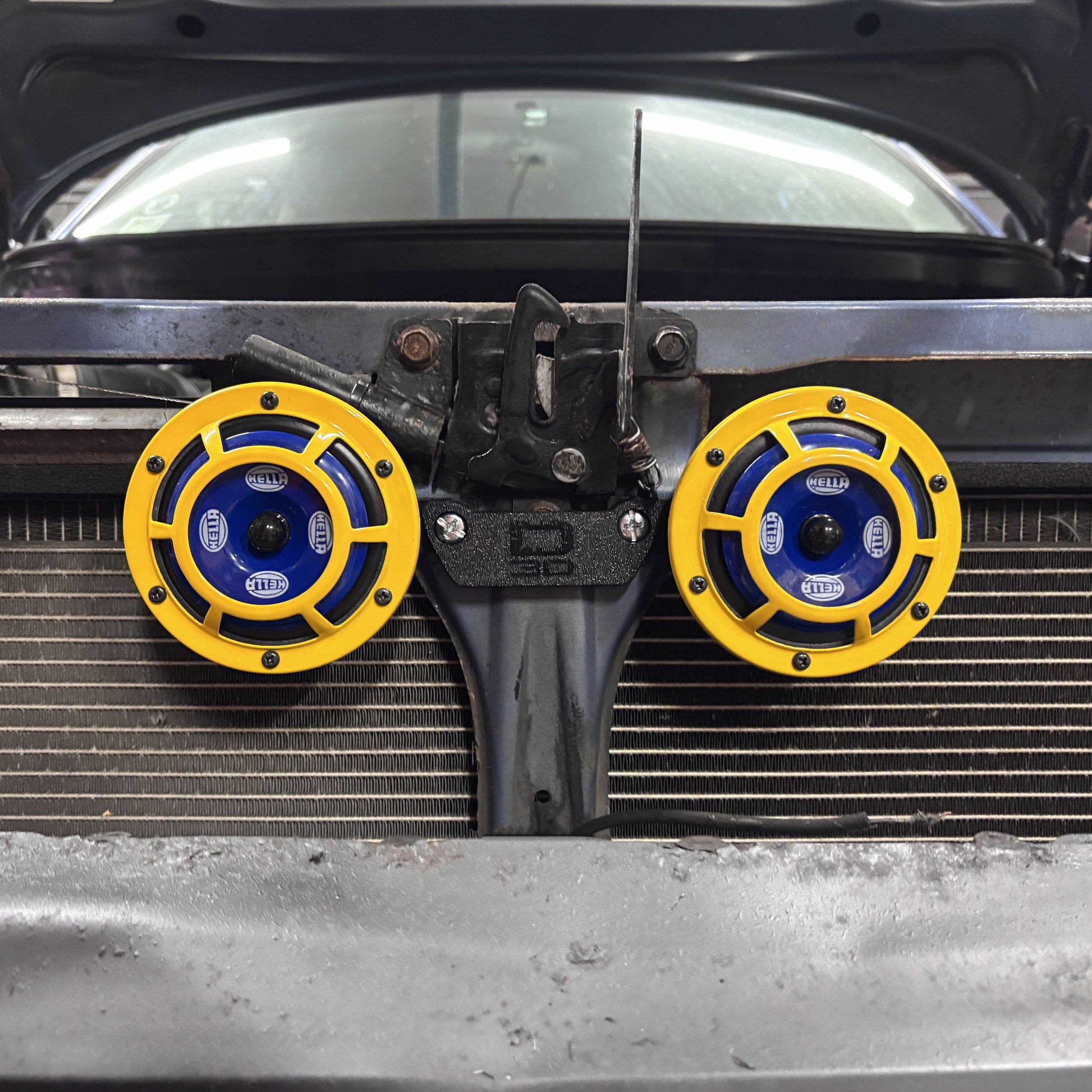 This bracket mounts to the vertical radiator support and requires removing one of the factory horns from its original location. It installs easily with the use of a Philips head screwdriver. Hella Horns are not included in this kit - this is a bracket only.